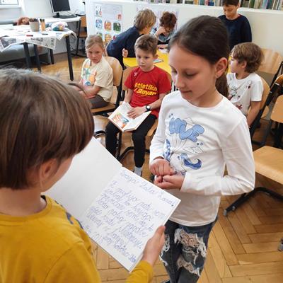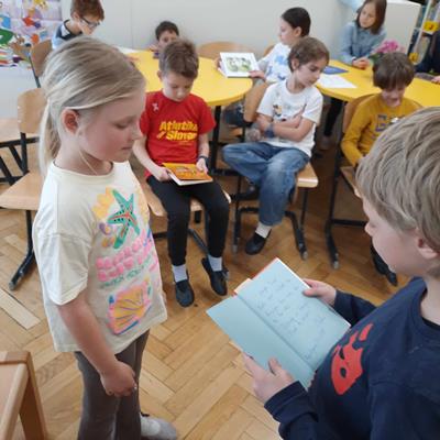 V sredo, 23. 4. 2025, na svetovni dan knjige in avtorskih pravic, smo v 2. b pripeljali do konca 13. Unescov projekt Menjaj branje in sanje. Na izmenjavo knjig z lastnoročno napisanimi posvetili smo se pripravljali ves teden. Najprej sem vsem učencem pojasnila, kaj je namen projekta, in jih pozvala k sodelovanju. Naučili smo se tudi napisati posvetila v knjige. Željo po izmenjavi knjig je nato izrazilo 12 učencev. Z njimi sem opravila žreb, da so vedeli, komu bodo knjigo podarili. Z mislijo nanj/nanjo so v knjigo napisali tudi posvetilo. V šolski knjižnici smo opravili izmenjavo knjig. Vsak je svojemu obdarovancu glasno prebral posvetilo, mu izročil knjigo in ga objel. Na obrazih so se jim izrisali prešerni nasmehi. Zelo so bili veseli lepih besed, ki so si jih namenili v posvetilih. Ogretih src so srečni z novo knjigo v roki odšli v razred in se posvetili branju.