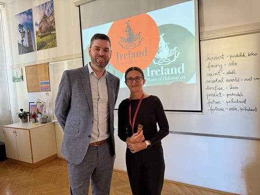 Vse to in še več smo v poprazničnem in popočitniškem tednu z učenci 7. b izvedeli na torkovi uri angleščine, ko nas je obiskal g. Hennessey z irskega veleposlaništva. Izvedeli smo, da praznik, ki ga danes praznujejo v vseh angleško govorečih državah in tudi drugje, izvira iz starih keltskih verovanj in tradicij na Irskem. Spoznali smo običaje, vraže in jedi, značilne za ta večer. Z gostom smo sproščeno klepetali v angleščini in si na koncu prislužili še priboljšek!