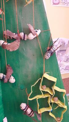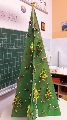 Na natečaj pod tem naslovom in pod okriljem Medexa in Hoferja smo se odzvali v 4. a. Predlogo smo najprej prebarvali na zeleno, da bi res nastala smreka. Po branju zgodbic in pesmic o čebelah smo iz arašidov izdelali čebelice in jim dodali krilca – javorjeva semena. Iz papirnatih tulcev smo izdelali satnice, ki smo jih oblikovali v zvezdice. Na smreko smo dali tudi medene okraske v obliki balončkov.
