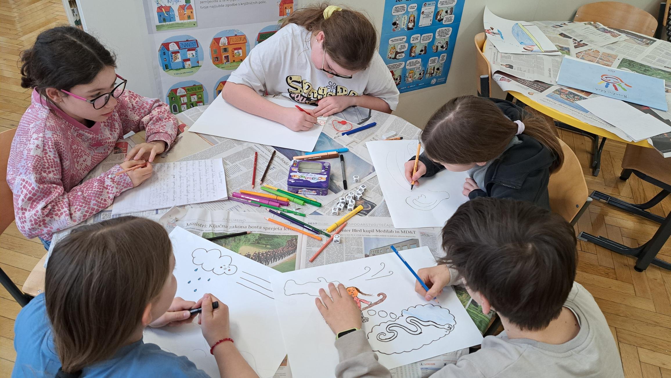 V nadaljevanju so se učenci skozi igro prelevili v pripovedovalce, pravljičarje, risarje in ilustratorje. V skupinah so ustvarili svoje zgodbe, jih zapisali ter jih duhovito ilustrirali.